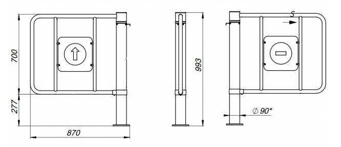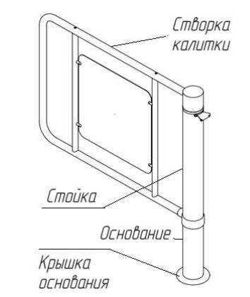 Калитка представляет собой неподвижную стойку (труба с фланцем), закрепленную на полу, и поворачивающейся створки (цилиндрическая голова с преграждающей дугой). На преграждающей дуге створки установлен щит, на котором нанесен знак с обозначением стрелки направления прохода, а на тыльной стороне нанесен знак запрета прохода.