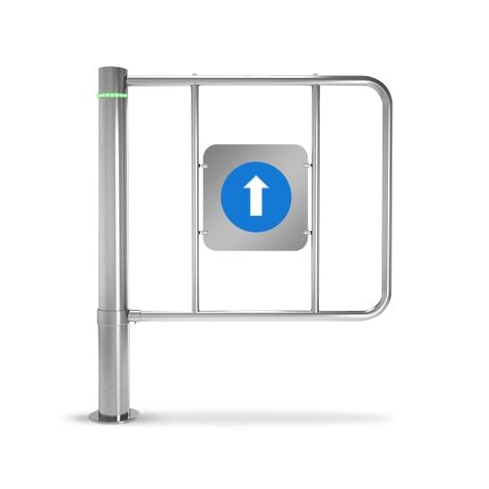 Калитка представляет собой неподвижную стойку (труба с фланцем), закрепленную на полу, и поворачивающейся створки (цилиндрическая голова с преграждающей дугой). На преграждающей дуге створки установлен щит, на котором нанесен знак с обозначением стрелки направления прохода, а на тыльной стороне нанесен знак запрета прохода.