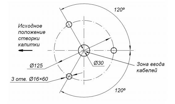 4. Установите стойку калитки фланцем на гильзы анкеров. Добейтесь вертикального положения стойки калитки (допускается использовать монтажные прокладки). Стойка калитки имеет значительную массу, придерживайте ее, не допускайте падения. Закрепите фланец тремя болтами М10×70 с внутренним шестигранником в соответствии с рис. 2.