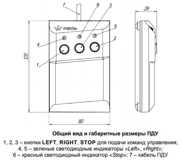 На лицевой панели корпуса ПДУ расположены три кнопки для задания режимов работы калитки. Над кнопками расположены индикаторы. Средняя кнопка (далее – кнопка STOP) предназначена для переключения калитки в режим работы «Запрет прохода». Левая и правая кнопки предназначены для открывания калитки в выбранном направлении. ПДУ снабжен зуммером для формирования звуковых сигналов.