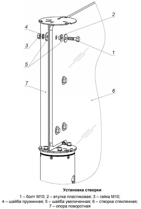 15. Произведите монтаж стеклянной створки. Для этого закрепите створку (6) на опоре поворотной (7) с помощью деталей (1) – (5). Внимание! При монтаже створки соблюдайте осторожность, не допускайте ее падения и ударов о металлические элементы стойки. По причине значительного веса створки при ее демонтаже рекомендуется подставить опору под нижний торец створки.
