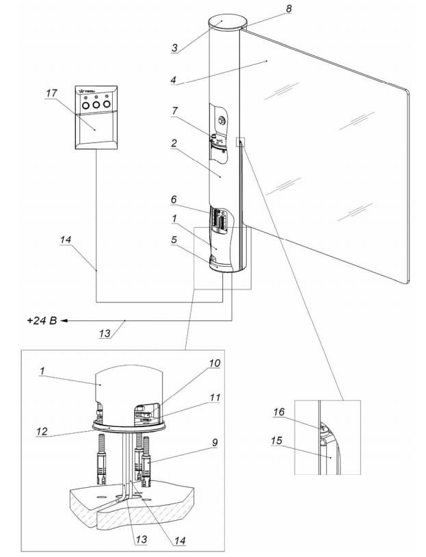 1 – неподвижное основание; 2 – корпус; 3 – крышка; 4 – стеклянная створка; 5 – металлическое кольцо; 6 – плата управления; 7 – поворотная опора; 8 – винт М3 (3 шт); 9 – анкер; 10 – гайка М10; 11 – шайба; 12 – пластиковое кольцо; 13 – кабель питания; 14 – кабель управления (от ПДУ / устройства РУ / контроллера СКУД ); 15 – планка декоративная; 16 – винт М4; 17 – ПДУ