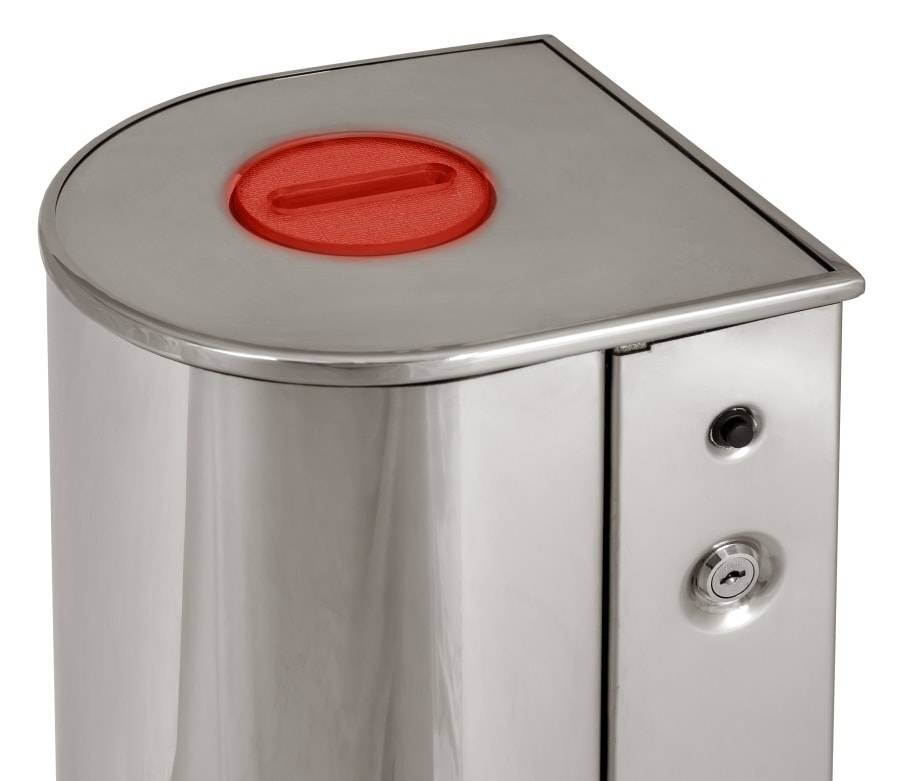 • Передняя стенка закрывается на замок, что позволяет обеспечивать санкционированный доступ к контейнеру. Сервисное и гарантийное обслуживание производиться при открытой передней стенке, что позволяет устанавливать картоприемник вплотную к стене