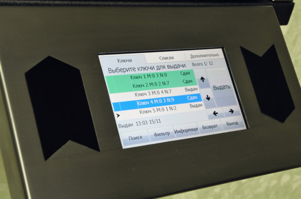 Супер яркий, большой, сенсорный TFT дисплей позволяет не только легко и просто управлять системой хранения ключей, но так же быстро получить любую интересующую Вас информацию. К примеру, кто и когда взял ключ или в какой ключнице на объекте находится данный ключ. Система позволяет осуществить поиск ключа по номеру или по названию, выдавать ключи списком.