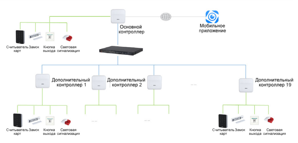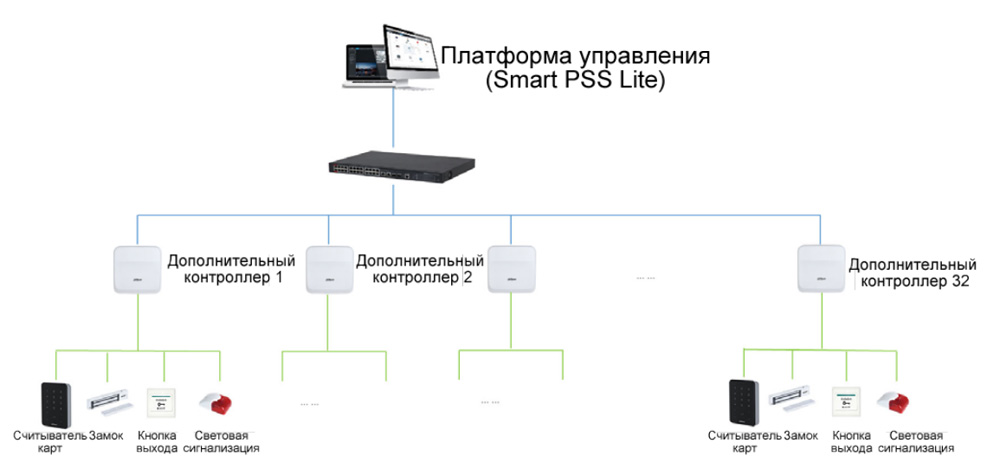 • В основном режиме контроллер самостоятельно выполняет функции платформы системы контроля доступа и может управлять 19 дополнительными контроллерами