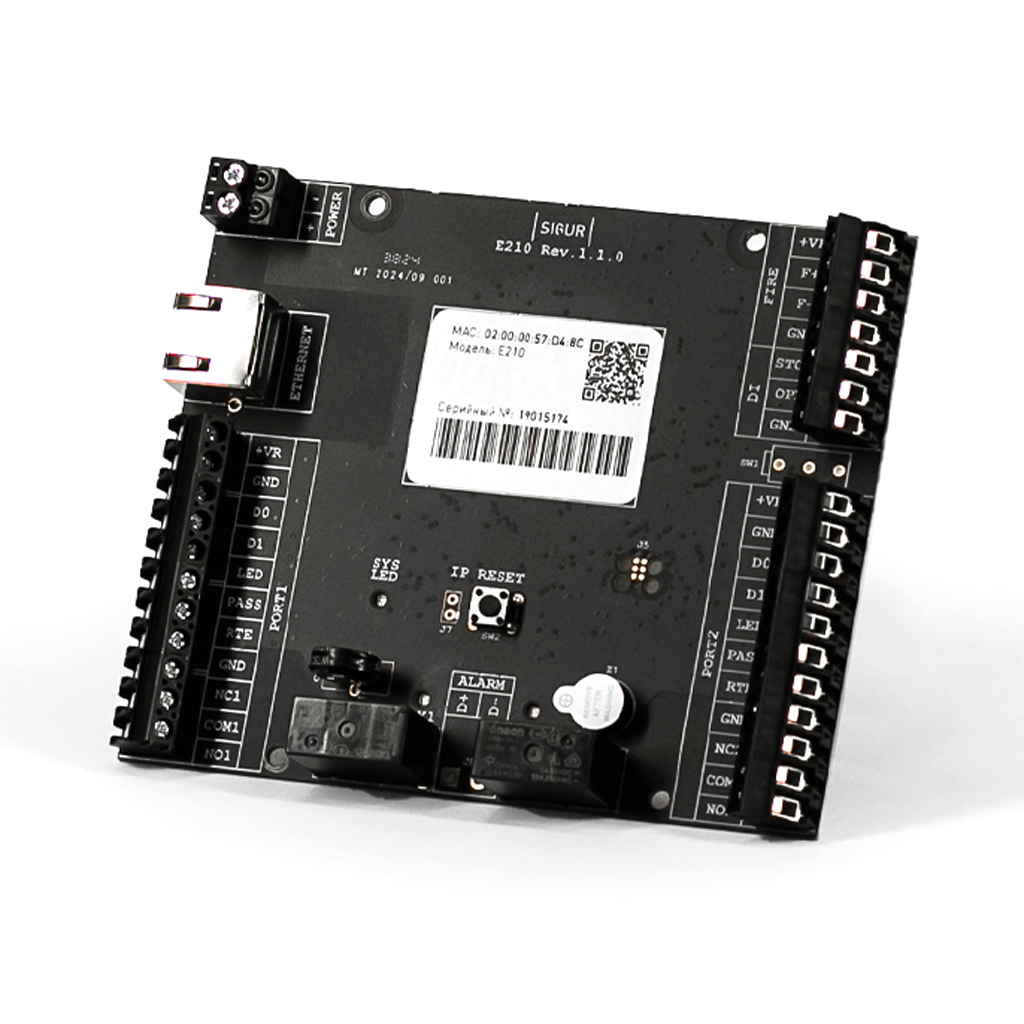 Контроллер SIGUR E210 в комплектации EMB предназначен для управления дверьми и турникетами. В зависимости от настроек одно устройство может одновременно управлять 2 точками прохода.