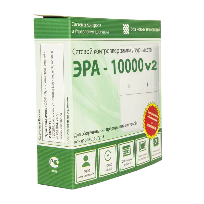 Контроллер для сетевых СКУД «ЭРА-10000 v2» поставляется вместе с фирменным бесплатным программным обеспечением «ЭНТ - контроль доступа», которое можно доработать под индивидуальные требования пользователя. В ПО включены средства автоматизированного формирования отчётов и рассылки авторизованным лицам, программа интеграции с IP-видеосистемами сторонних производителей с возможностью просмотра фрагментов фиксации прохода. Все контроллеры оснащены выходами «открытый коллектор» для управления электромеханическими и электромагнитными замками, а также кнопкой выхода. Кроме того, он взаимодействует с турникетами, шлагбаумами, приводами ворот, картоприемниками.
