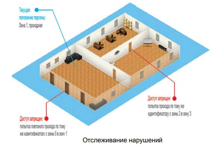 Помещение объекта разделено на комнаты – зоны доступа. При таком делении вход в другую зону - выход из предыдущей, и проход в зону возможен через различные двери.