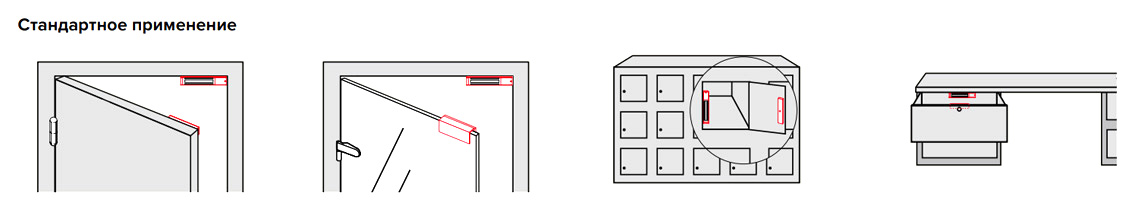 Возможна установка на сплошные, профильные и цельностеклянные двери распашного (в т. ч. маятниковые) и раздвижного типа, снаружи и внутри помещения.