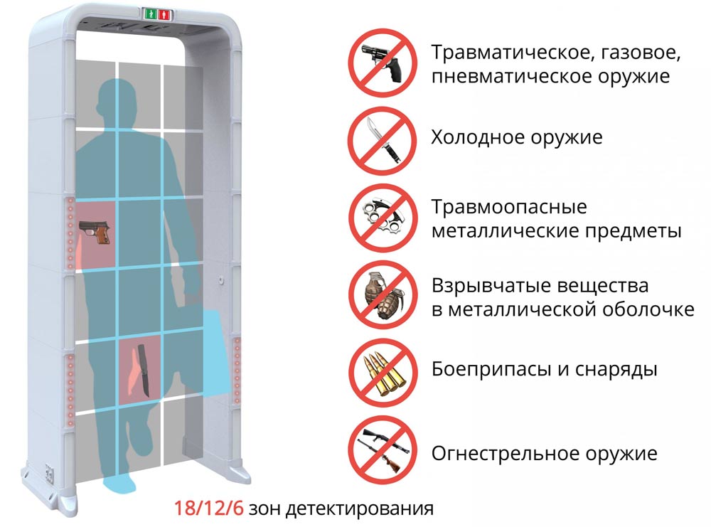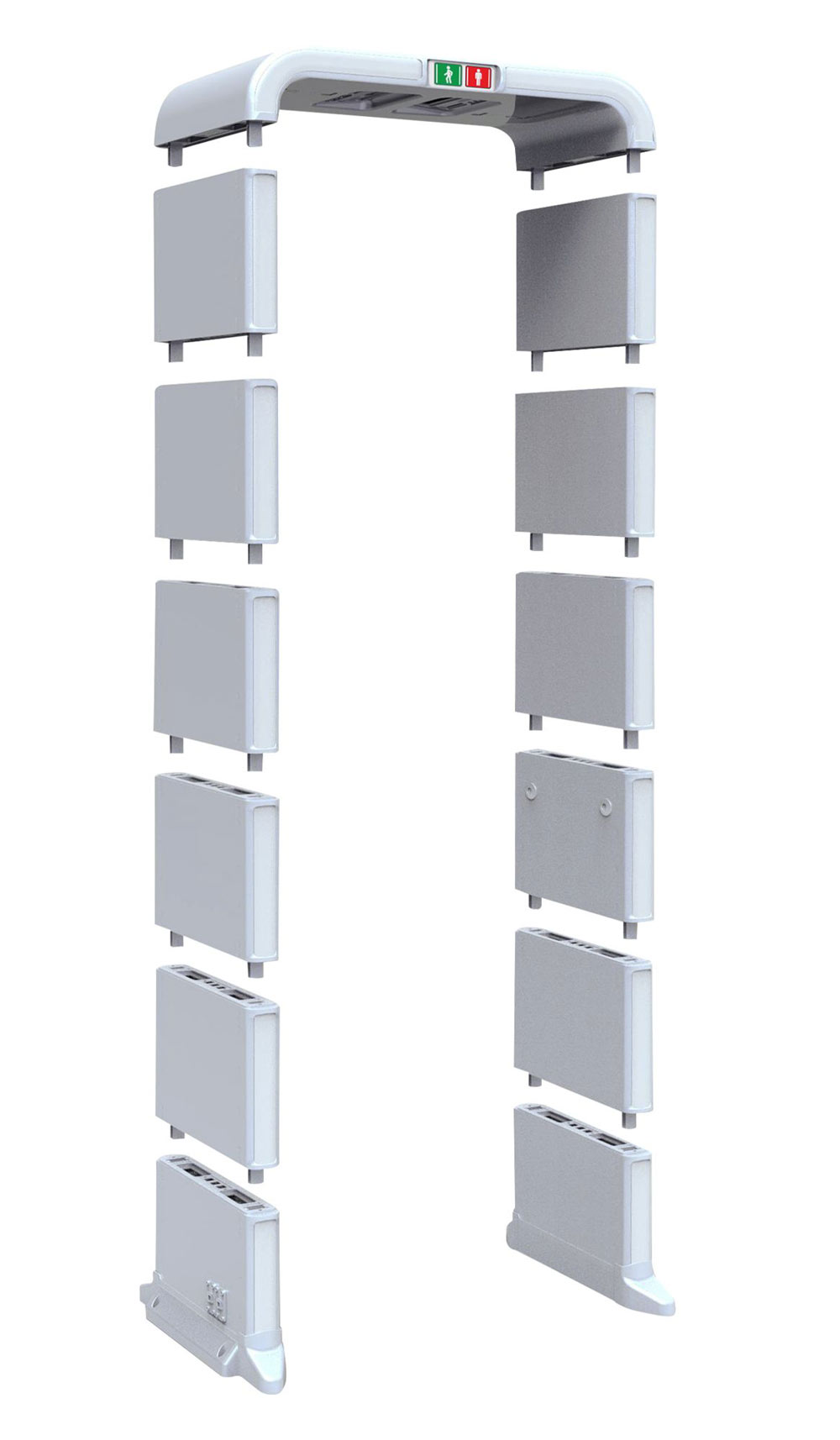 Сборно-разборная модель металлодетектора состоит из 13-ти отдельных частей, которые соединяются между собой по принципу пазла. PC P 1800 M K предполагает выбор количества зон детектирования (18/12/6) в зависимости от важности охраняемого объекта, его уровня требований к безопасности. Арочная панель обладает функцией узконаправленного детектирования – выставляются параметры запрещенных предметов (вес, объем, размер), что исключает срабатывание светозвуковой тревоги на металлические предметы бытового характера: часы, пряжки, ключи.