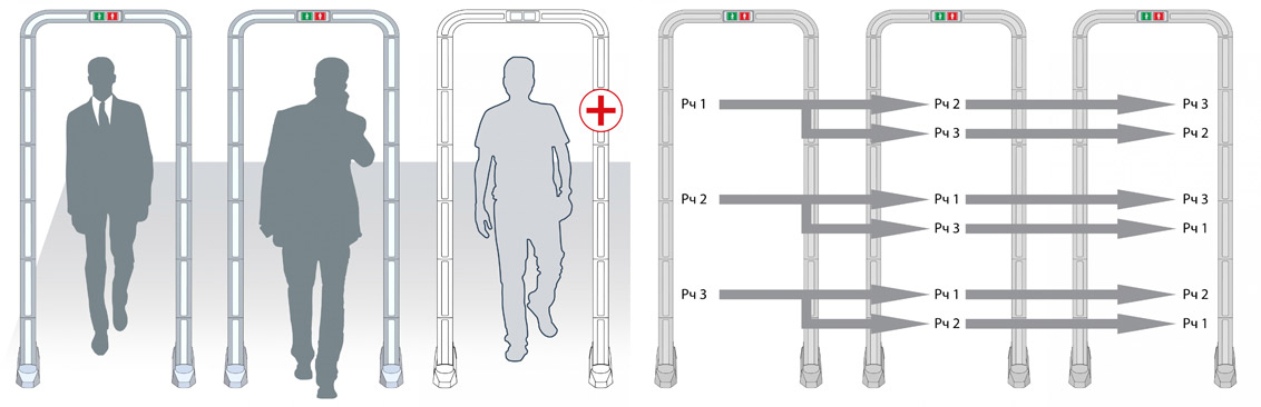 Устанавливать арочные металлодетекторы можно в ряд параллельно друг другу или в ступенчатом порядке, соблюдая дистанцию между блоками не менее 500 мм. Рабочая частота электромагнитного поля для работы оборудования без помех при установке большого числа металлодетекторов подбирается автоматически, благодаря пакету изготовленных программ "быстрой" настройки. Для стоящих рядом устройств предписывается вводить разные данные рабочих частот.