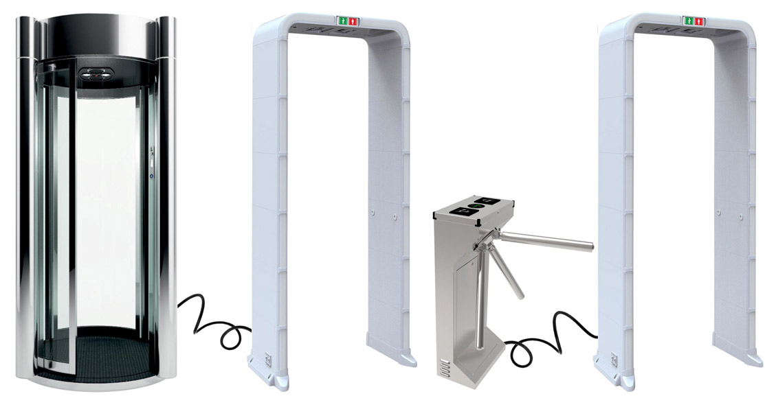 Многозонный интеллектуальный арочный металлодетектор можно объединить со сторонним оборудованием: турникеты, тамбур-шлюзы, автоматические двери, шлюзовые кабины. Всё это достигается за счёт оборудованного выхода для соединения с устройствами безопасности (сухие контакты).