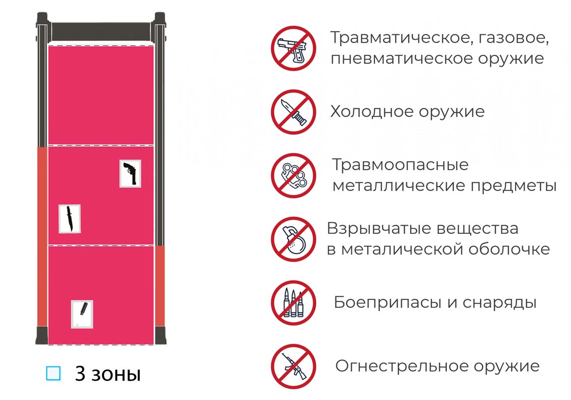 При пересечении человеком с запрещенным предметом арки металлодетектора боковые панели подадут сигнал тревоги и заблокируют турникет или любое другое устройство, используемое параллельно с металлодетектором, что сделает дальнейшее движение посетителя невозможным.