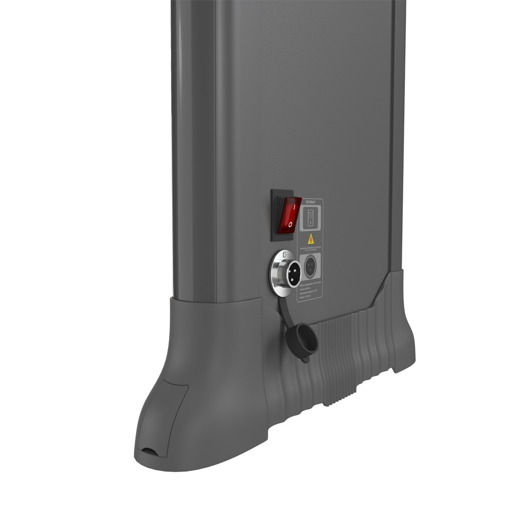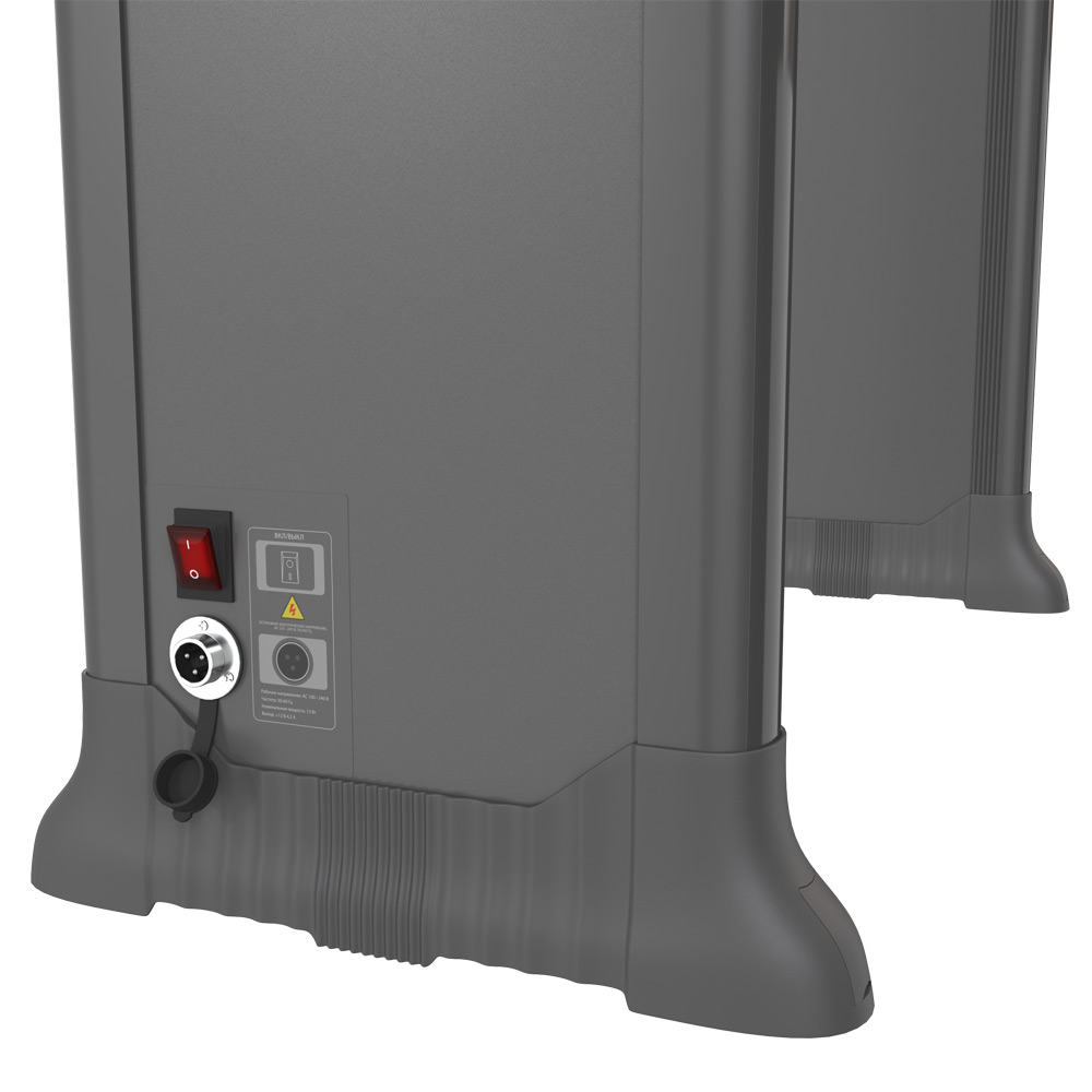 Точки внешних подключений металлодетекторов БЛОКПОСТ серии «Матрёшка». Все изделия оснащены двумя релейными разъёмами для подключения дополнительных устройств (сухие контакты). Эти разъемы позволяют интегрировать устройства в систему контроля доступа, включающую, например, шлюзовые кабины, турникеты, автоматические двери. При обнаружении металлического предмета (согласно заданным параметрам чувствительности и длительности сигнала тревоги) металлодетектор одновременно замкнёт первый релейный выход, после чего исполнительное устройство будет блокировано. Если предметы на теле человека или в его одежде допустимы согласно заданным параметрам, изделие замкнёт второй релейный выход, после чего исполнительное устройство будет разблокировано.В изделии предусмотрены три точки подключения к сети 220 В верхней части: снизу, на левой и правой антенных панелях. Все точки подключения к сети 220 В защищены быстродействующим плавким предохранителем. Присутствует также специальный разъём для литий-ионных аккумуляторных батарей. Время автономной работы изделия составляет от 4 часов и дольше. В меню интерфейса в реальном времени отображается уровень заряда аккумуляторной батареи.