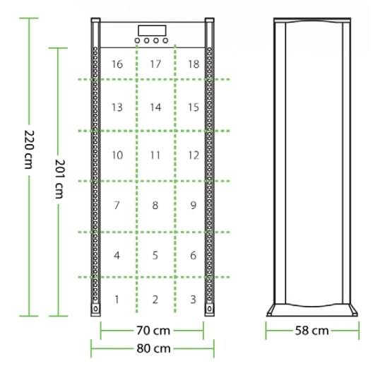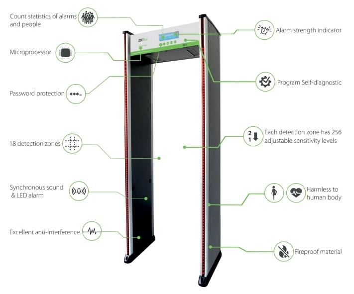 На боковых панелях рамки металлодетектора располагаются светодиодные индикаторы, которые срабатывают одновременно со звуковой сигнализацией, что облегчает обнаружение металлических предметов. Металлодетекторы имеют счетчик проходов для подсчета посетителей и сигналов тревоги.