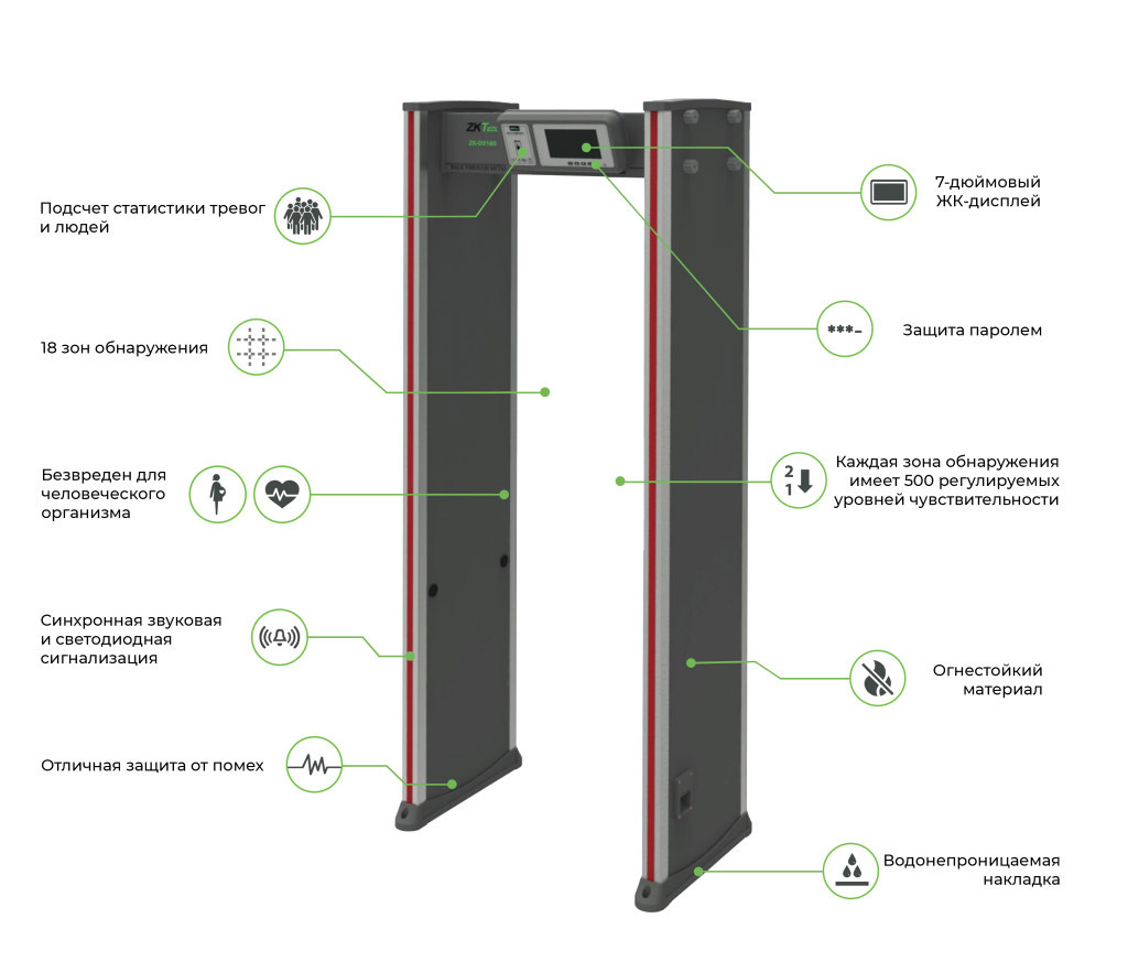 ZKTeco ZK-D3180 - проходной арочный металлодетектор обладает 18 зонами обнаружения. Каждая зона обнаружения имеет 500 регулируемых уровней чувствительности. Настроив их вы можете исключить детектирование металлических предметов малых размеров, например ключей, монет, ремней, украшений и т.д. Металлодетектор имеет LCD дисплей 5.7' на котором отображается количество тревог по обнаружению металлических предметов и количество успешных проходов. При обнаружении металлического предмета происходит синхронная светозвуковая индикация.