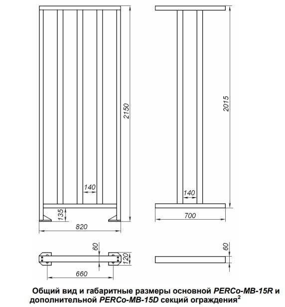 Размер основной секции ограждения PERCo-MB-15R 2215×930×202 мм