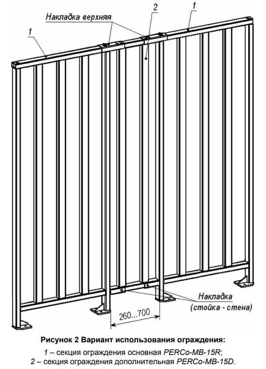 Может быть использовано и в качестве отдельного самостоятельного ограждения, и как дополнительное оборудование с турникетом PERCo-RTD-15 и калиткой PERCo-WHD-15, при этом ограждение выполнено в одном стиле с указанными преграждающими устройствами и соединяется с ними в единую конструкцию.