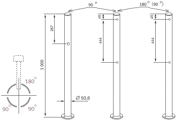 Стойка ограждения из нержавеющей шлифованной стали. 6 отверстий с резьбой М8. Заглушка стойки выполнена из нержавеющей полированной стали, что делает изделие более практичным в использовании.