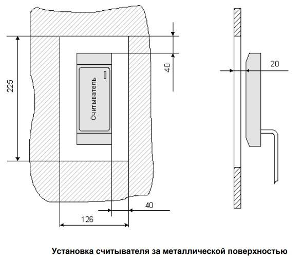 • при установке считывателя за металлической поверхностью, в ней необходимо вырезать окно, напротив которого, равноудалено от краев окна, и устанавливается считыватель, при этом размеры окна должны быть не менее 220×126 мм. Само окно может быть закрыто неметаллической вставкой (например, из пластмассы), а считыватель может быть утоплен вглубь окна на расстояние не более 20 мм от внешней стороны металлической поверхности – дальность считывания кода при таком способе монтажа считывателя уменьшается на 30 – 50%;