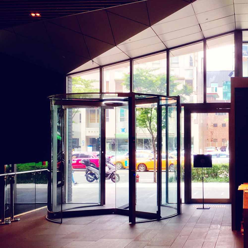 • Полностью стеклянная карусельная дверь с приводом сверху