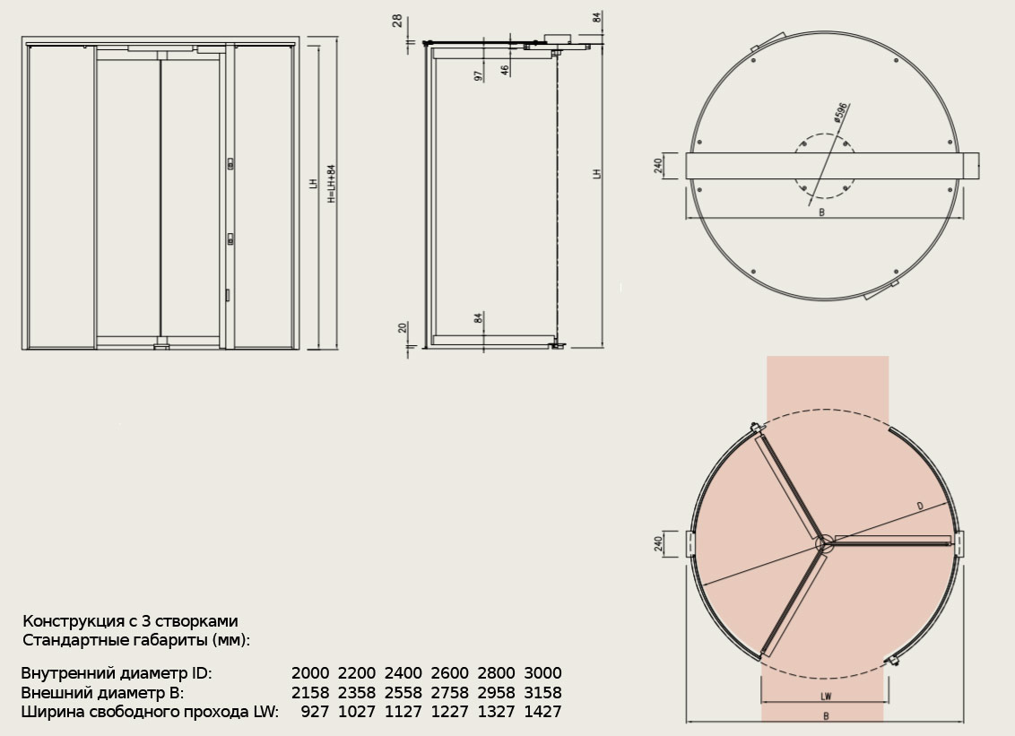 | Тип карусельной двери | большой ёмкости | большой ёмкости | стандартная | полностью стеклянная | индивидуальная | защитная |