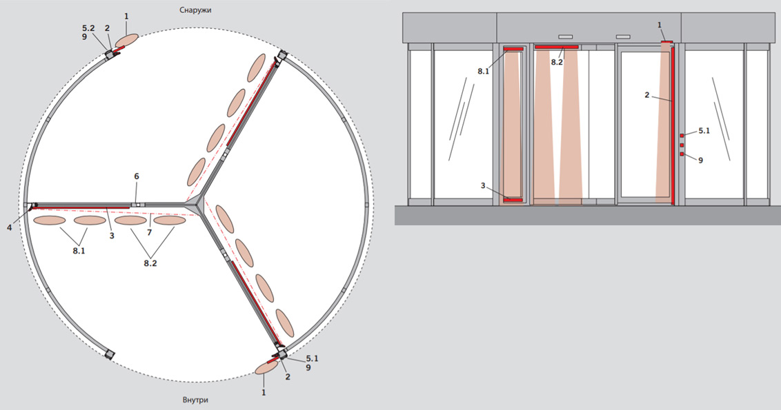 Карусельные двери КТС3/КТС4 снабжены множеством разнообразнейших компонентов по обеспечению безопасного прохождения через них людей и грузов.