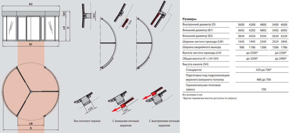 Карусельные двери КТС 3 предлагаются в 5 стандартных размерах. Имеются различные модификации 3-створчатых карусельных дверей.