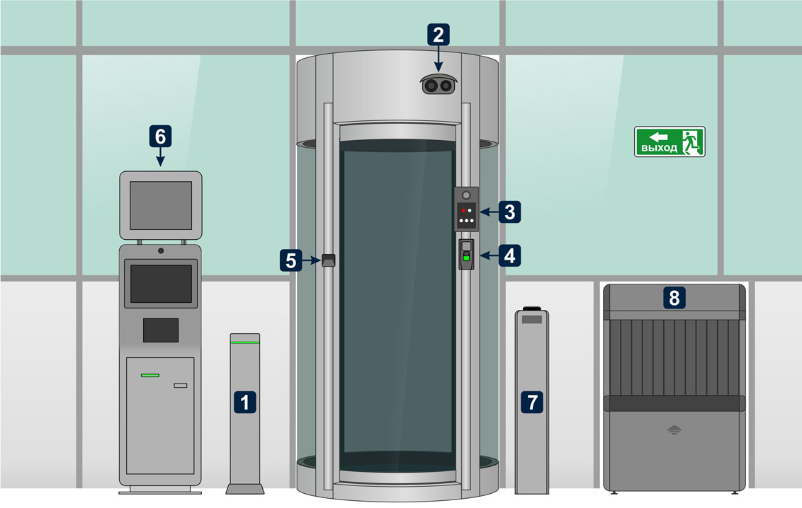 Датчики весовой платформы и объемные датчики расположены внутри кабины и позволяют определить присутствие человека или других предметов в кабине.