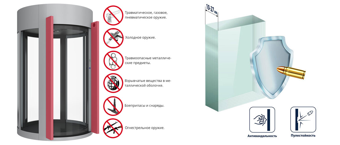 Боковые стенки и раздвижная дверь: Ударопрочные и пуленепробиваемые боковые панели, стеклянные двери, многослойное стекло 27 мм.