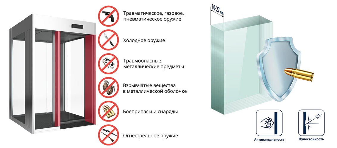 Поддерживаемые функции | Контроль прохода по одному, Контроль оставленных предметов, Металлодетектор, Антипаника, Механическая блокировка, Переговорное устройство, Видеокамера, Биометрические устройства, Считыватели RFID карт, Алкотестер, Картоприемник, Тепловизор, Электронное бюро пропусков, Радиационный монитор, Рентгенотелевизионная установка (интроскоп) |