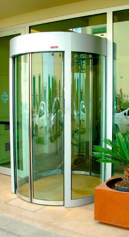 Автоматическая шлюзовая кабина овальной формы с двумя полукруглыми сдвижными дверьми и дополнительным боковым выходом производства компании Saima Sicurezza S.p.A. (Италия).