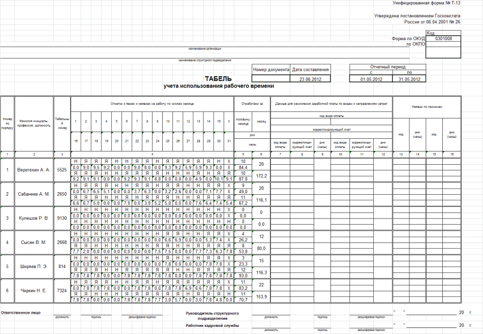 - Наработка персонала (Табель). Стандартная форма Т-13. Учет по графику или по факту. Смотреть пример отчета.