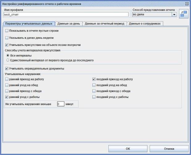 Для создания необходимых отчётов с индивидуальными настройками можно добавлять произвольное количество профилей. Также в профиле настраивается способ представления отчёта: по сотрудникам, по датам, отделы по алфавиту, отделы по вложенности.
