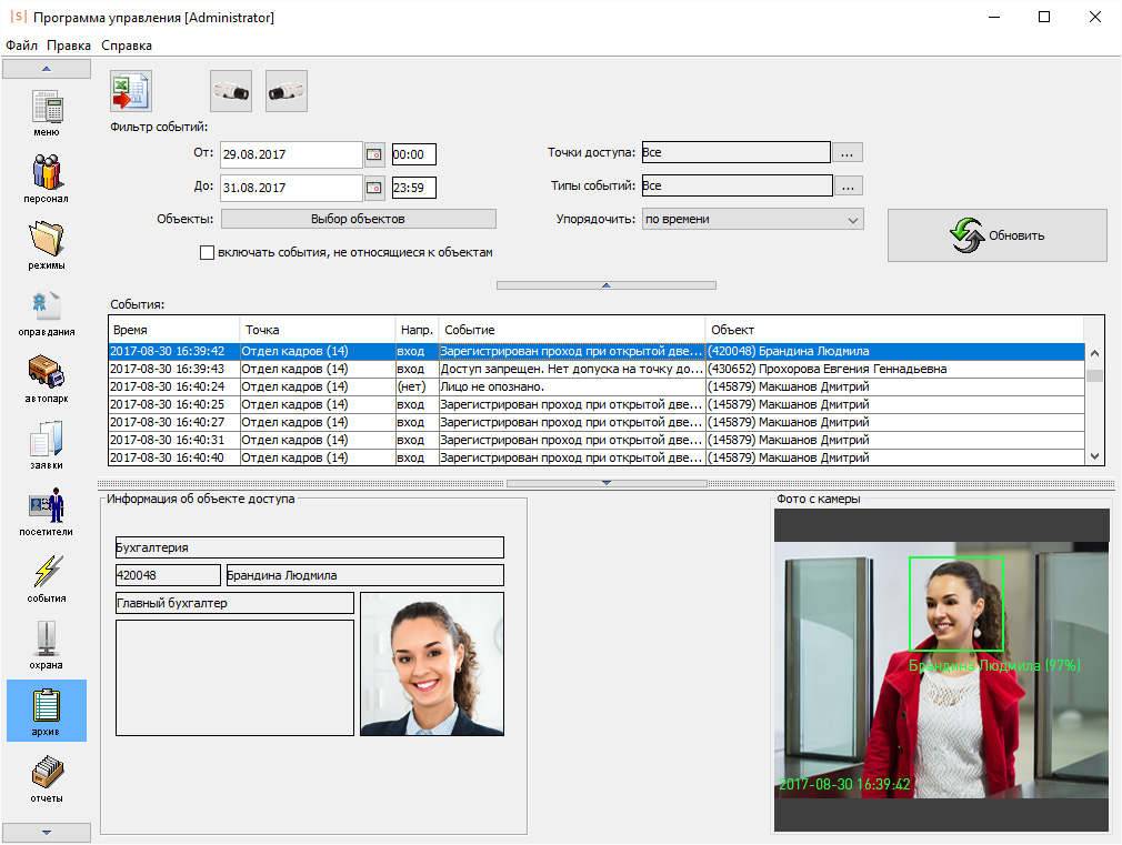 • «жестким»: после идентификации по основному признаку система производит сравнение изображения, полученного с камеры с фотографией сотрудника. В случае, если лицо не распознано или сотрудник не появился в кадре в течение 5 сек, система запрещает доступ.