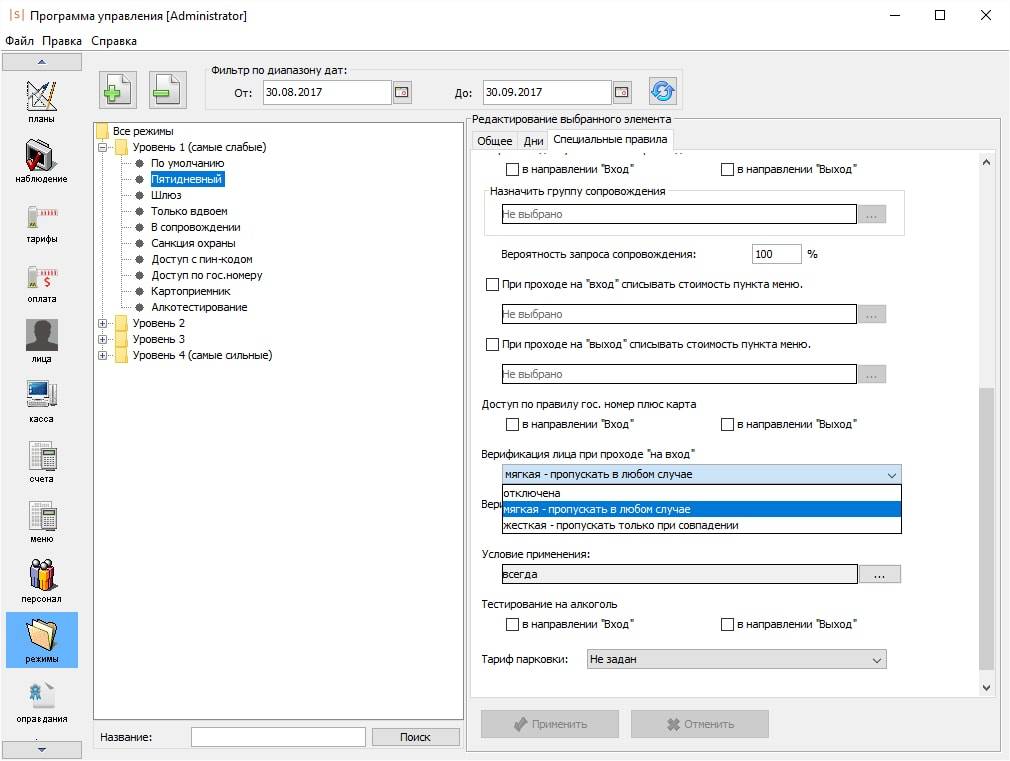 • «жестким»: после идентификации по основному признаку система производит сравнение изображения, полученного с камеры с фотографией сотрудника. В случае, если лицо не распознано или сотрудник не появился в кадре в течение 5 сек, система запрещает доступ.