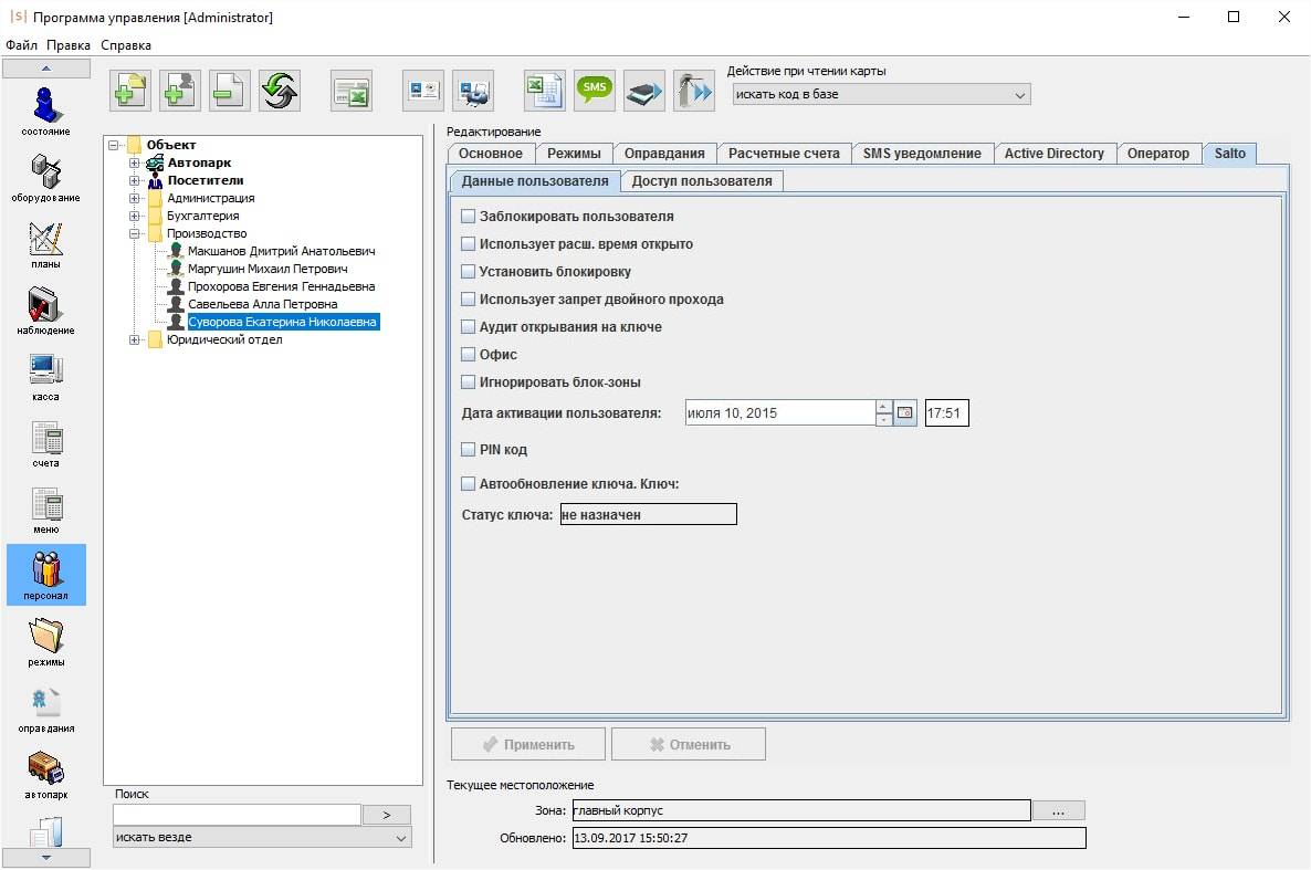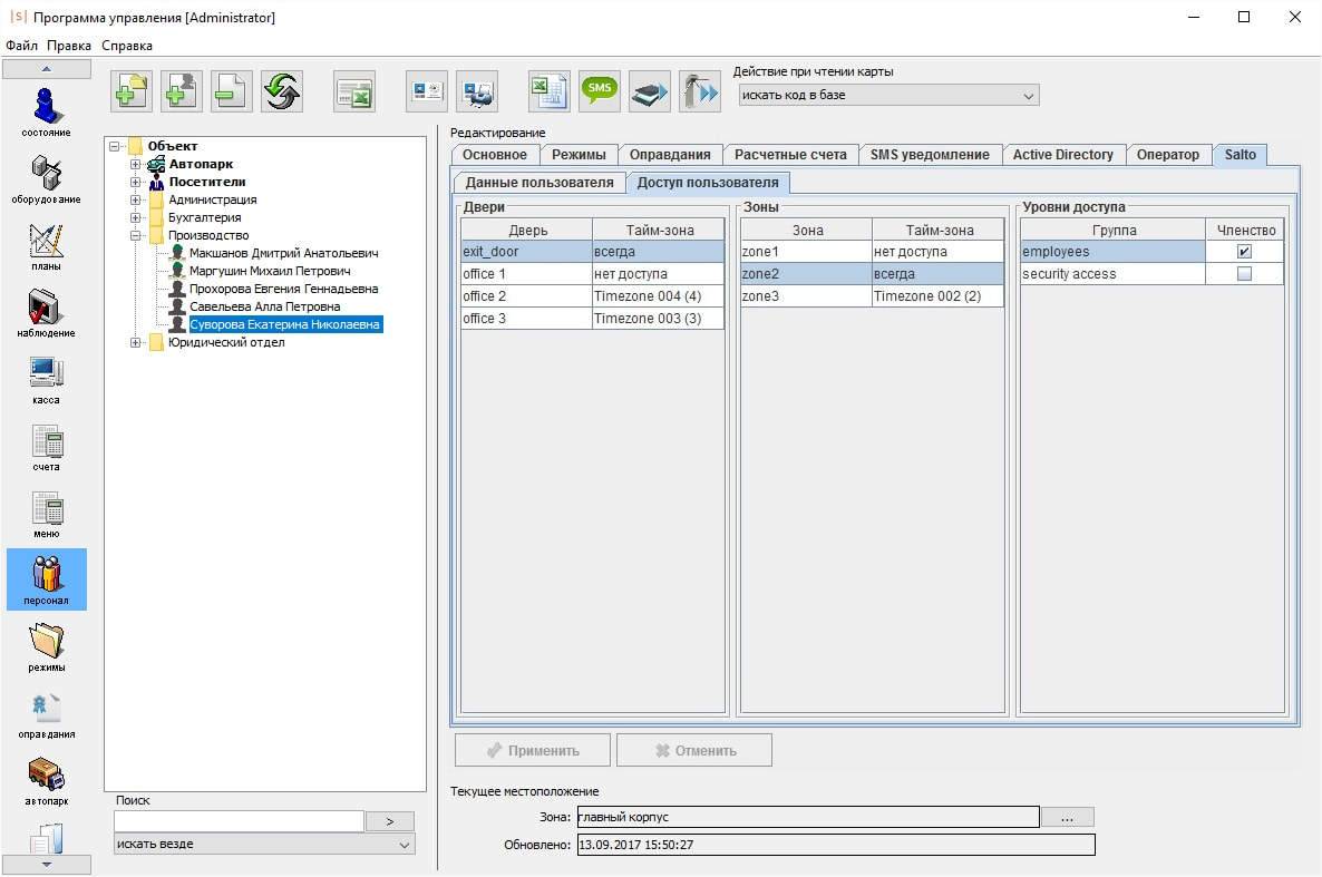 Конфигурация оборудования, создание временных зон, которые затем будут назначаться сотрудникам, выполняется в программном обеспечении Salto ProAccess. Текущая работа с интегрированной системой, включая заведение сотрудников (поддерживается Unicode и, соответственно, кириллические символы) и назначение им временных зон, выполняется в интерфейсе Sigur и не требует работы в стороннем программном обеспечении.