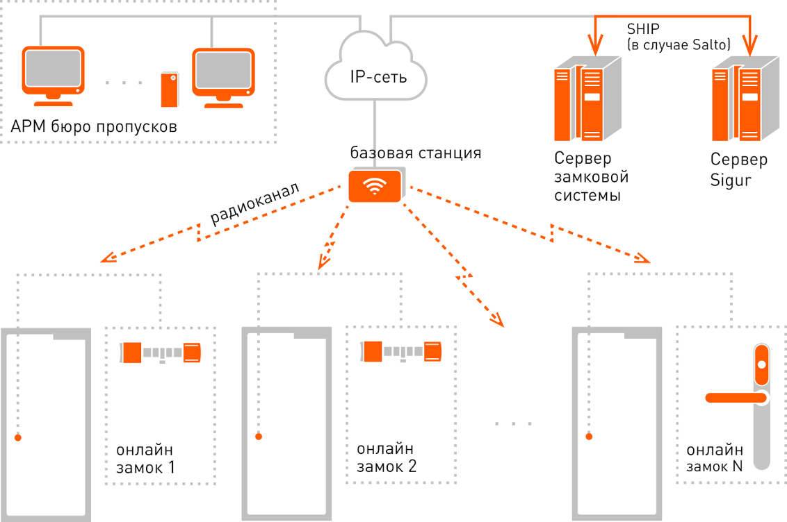 Интеграция с замками Dormakaba и Salto реализована на программном уровне, поэтому необходима постоянная связь с сервером Sigur.Взаимодействует замок с сервером Sigur через коммуникационное устройство (хаб, базовая станция), включенное в IP-сеть объекта. К одному устройству можно подключить несколько замков. Для управления замками необходима постоянная связь с коммуникационным устройством.