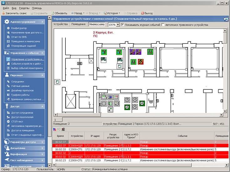 Возможность непрерывного контроля охранно-пожарной обстановки с ее визуализацией на мониторе сотрудника безопасности и оперативного реагирования на нештатные ситуации реализуется в разделе S-20 «Центральный пост охраны».