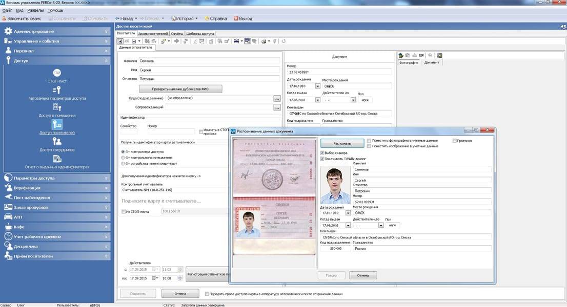 Возможность распознавания документов появляется в модуле PERCo-SM03 «Бюро пропусков» после установки модуля «Распознавание документов» и после подключения и настройки сканера: