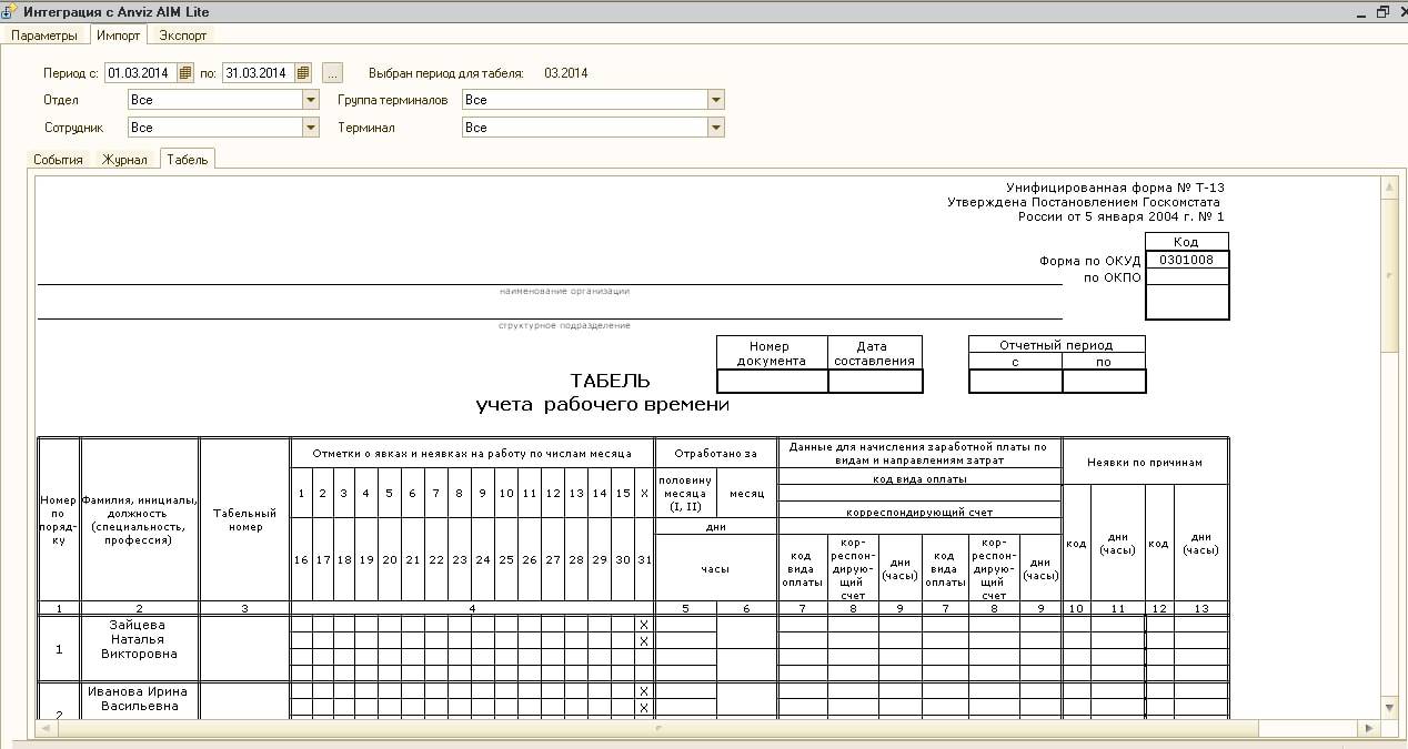 На основании данных журнала рабочего времени обработка строит отчет в форме табеля Т13 с возможностью сохранения его в форматах ms excel, htm, pdf и других.