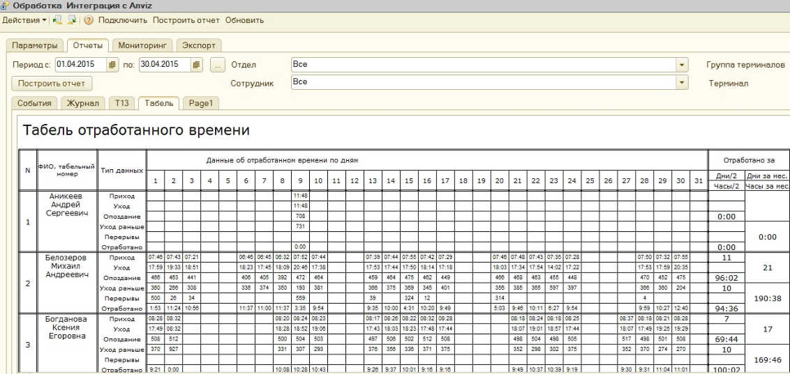 На основании полученного списка событий с учетом использованных фильтров модуль интеграции Anviz – 1С строит отчет с построчным отображением отработанных интервалов, которые рассчитываются с учетом перерывов, отмеченными сотрудниками в течение дня. Журнал рабочего времени также отражает – интервалы времени между приходами и уходами, считающиеся рабочим временем, сумму интервалов за день, опоздание, уходы раньше.