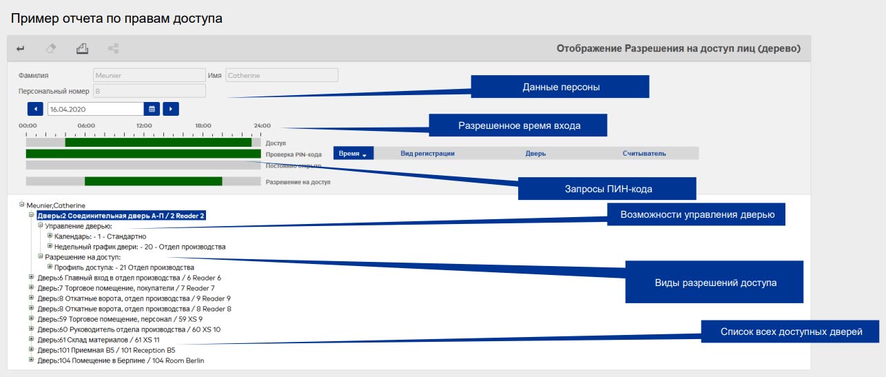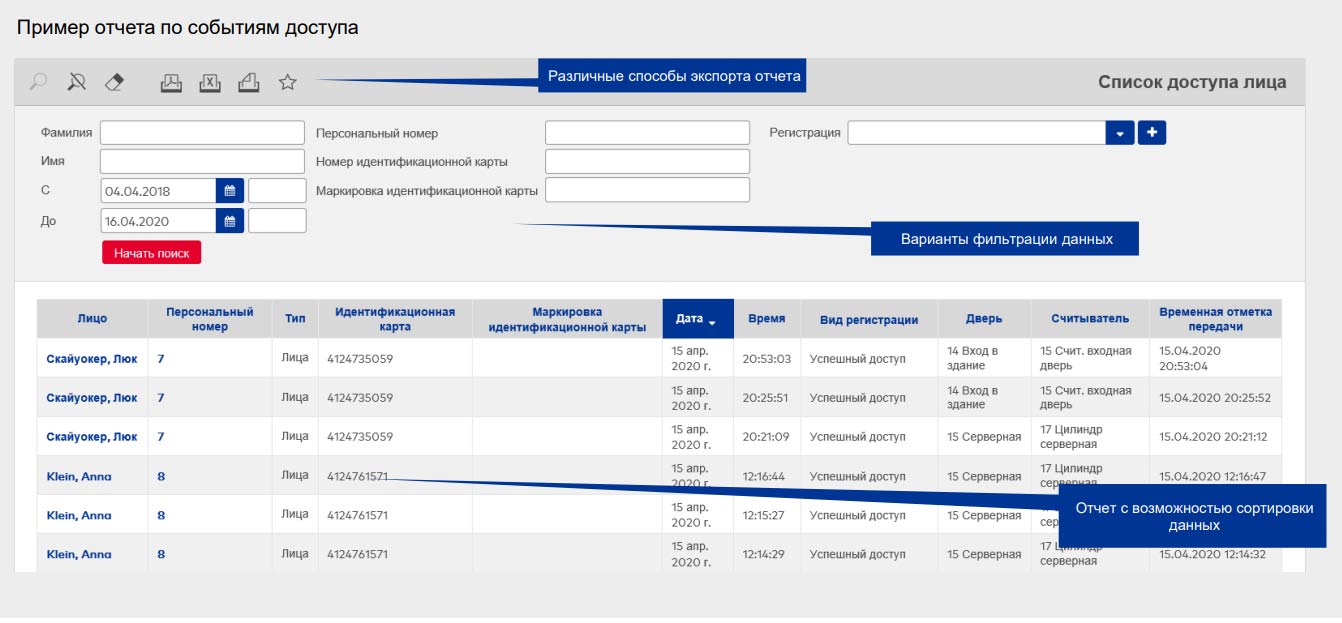 Различные варианты отчетов с гибкими возможностями фильтрации – события доступа через определенные точки, события от определенных лиц, права доступа сотрудников, история выдачи карт и т.п. Возможность автоматической генерации и рассылки отчетов.