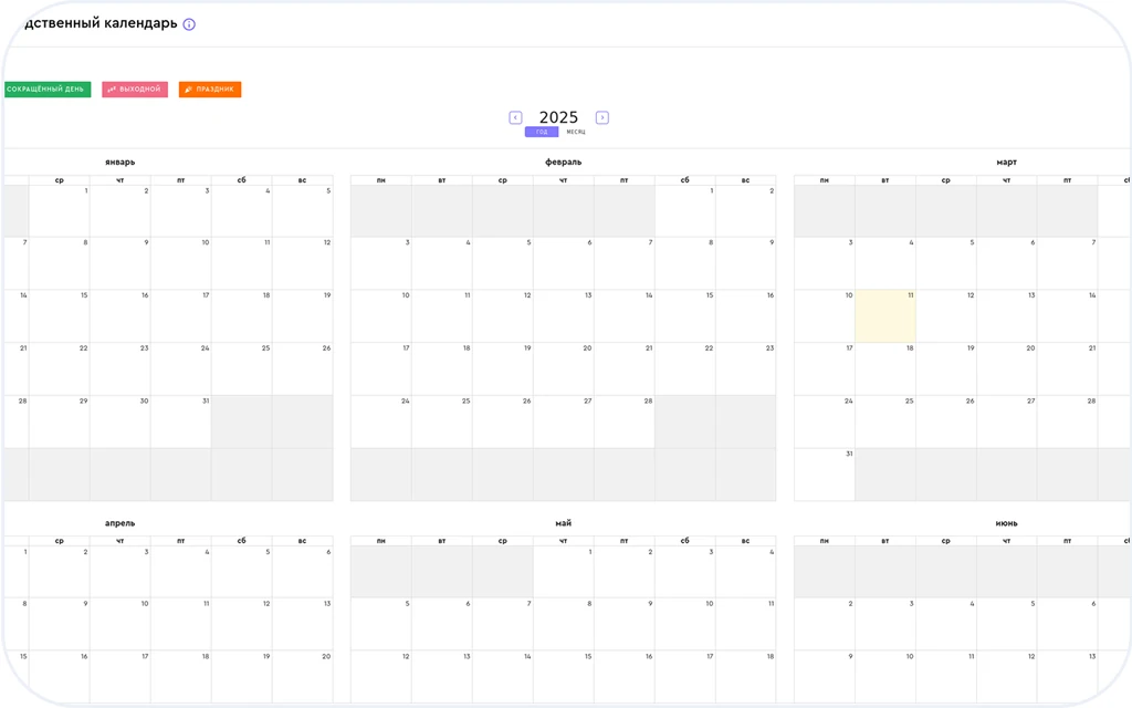 Возможность настраивать выходные, праздники и сокращенные дни прямо в производственном календаре для наглядности.