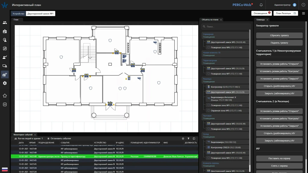 PERCo-WM05 Модуль «Мониторинг» предназначен для организации наблюдения на объекте и управления устройствами системы в ручном режиме на создаваемом в разделе системы плане предприятия.
