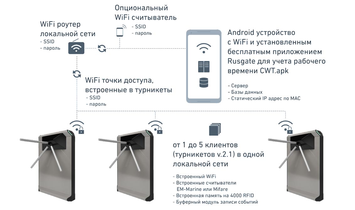 (Турникеты в указанной комплектации оснащены встроенной WiFi точкой доступа, встроенными считывателями формата Em-Marine, Mifare или универсальными Em-Marine + Mifare);