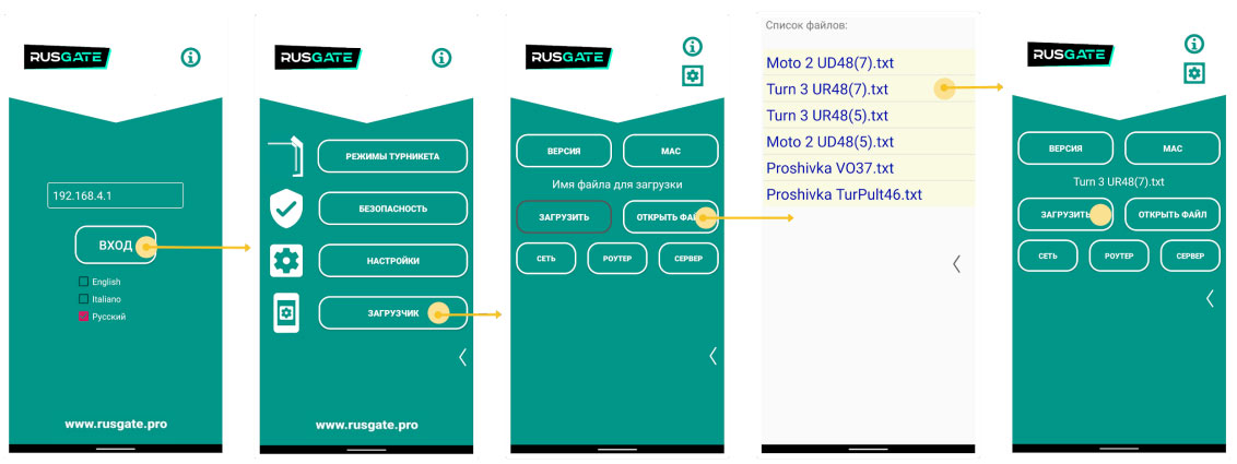 5. После подключения к турникету, используя установленное приложение Мастеркард, выполните прошивку турникета выбрав в меню системный файл версии не ниже Turn3 UR48(7) для электромеханических триподов или Moto2 UD48(7) для моторизованных двуподов: