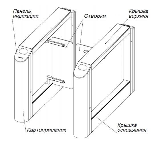 Корпус турникета выполнены из шлифованной нержавеющей стали, преграждающие створки – из закаленного стекла. Конструкция турникета имеет в своем составе интегрированный картоприемник. В нижней части модуля предусмотрена крышка основания для доступа к отверстиям для ввода кабелей БП, ПУ и СКУД.