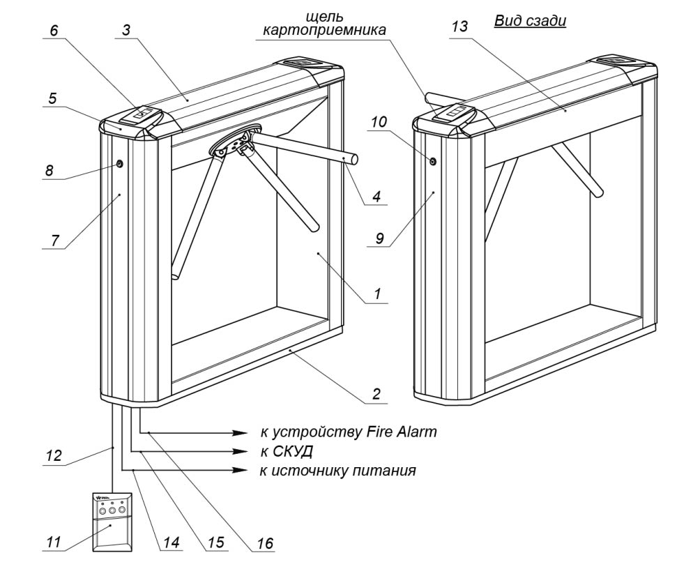 1 – каркас; 2 – основание; 3 – крышка; (позиции 1-3 образуют стойку турникета); 4 –планка преграждающая, 5 – крышка торцевая со считывателями; 6 – блок индикации; 7 – заглушка стойки; 8 – замок заглушки; 9 – контейнер картоприемника; 10 – замок контейнера картоприемника; 11 – ПДУ; 12 – кабель ПДУ; 13 – установочный винт, фиксирующий крышку Не входит в стандартный комплект поставки: 14 – кабель питания; 15 – кабель подключения к СКУД, 16 – кабель устройства Fire Alarm