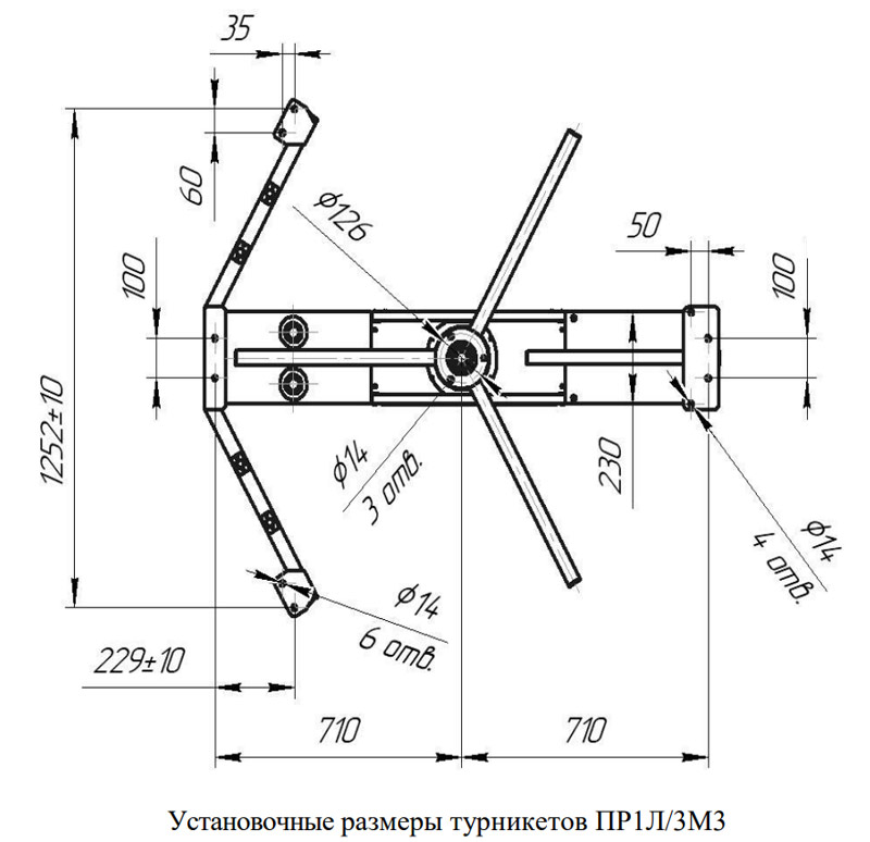 Турникет состоит из следующих частей: стойка крыла прохода 1, стойка ограничения прохода 2, которые крепятся к полу анкерными болтами. К стойкам фронтально крепится рама привода 3. На площадки рамы устанавливается механизм 4. На валу механизма закреплена эластичная муфта, к фланцу которой крепится верхний фланец центральной стойки. Центральная стойка состоит из трех лопастей 5, которые скрепляются между собой и крепятся к верхнему и нижнему фланцам. Нижний фланец закреплен к валу опоры центральной стойки 7.